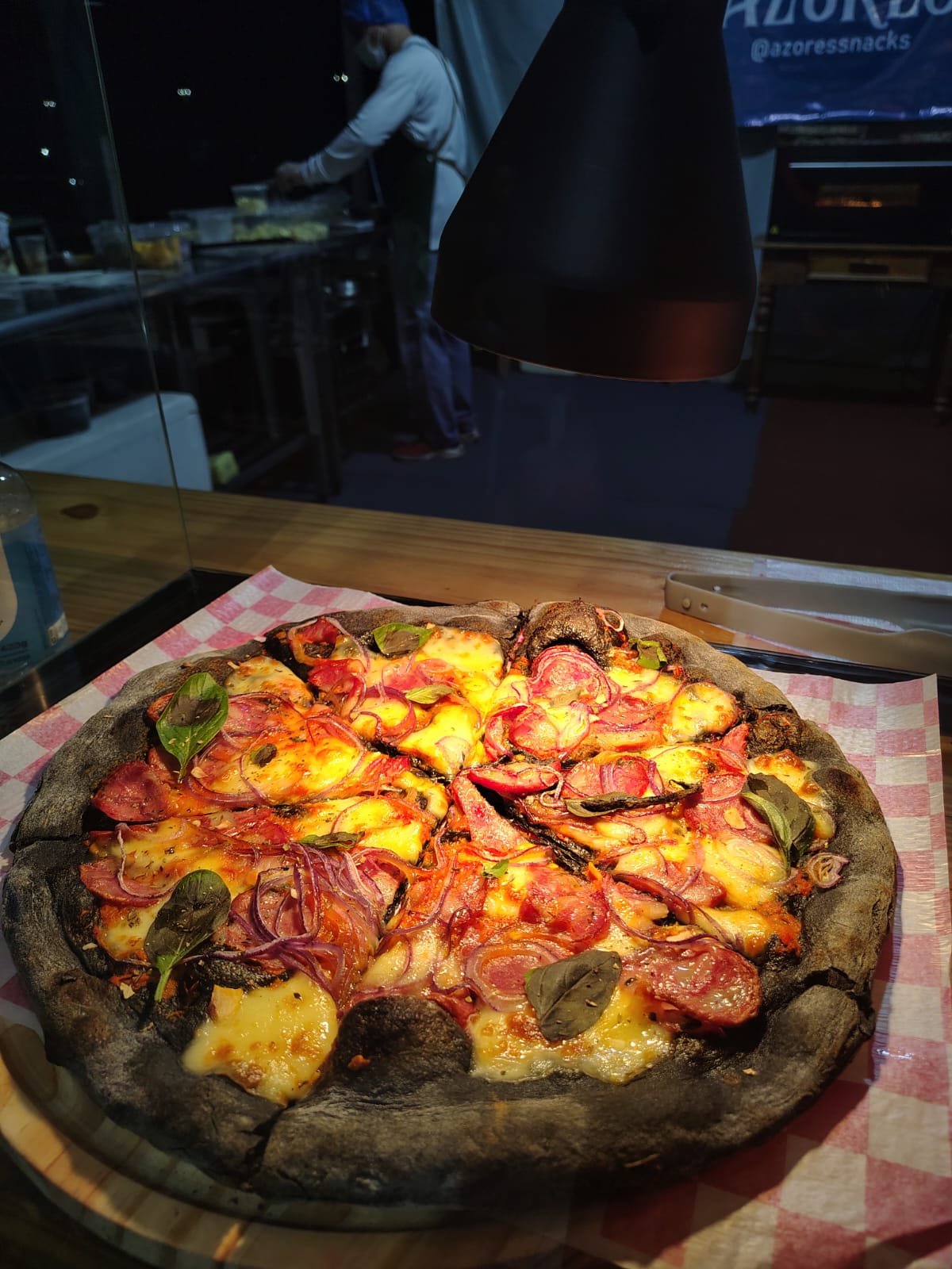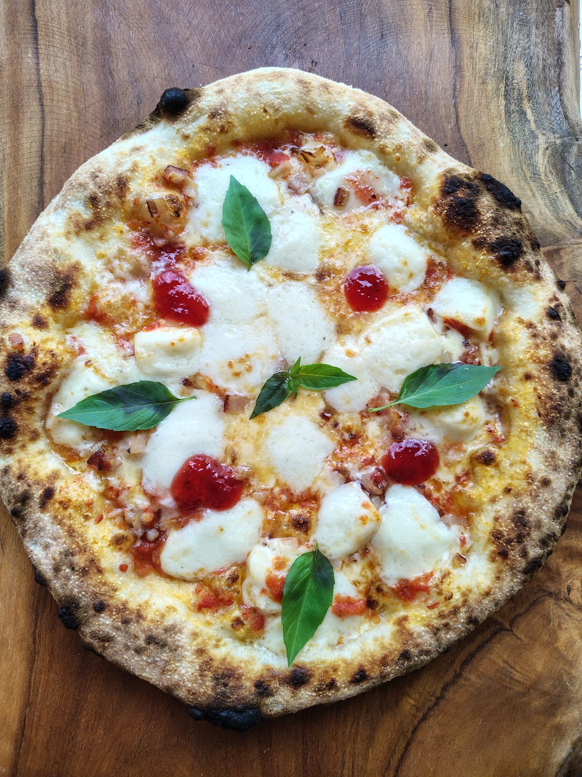 Pizza feita com fermentação natural (levain duro), respeitando o tempo da massa e o processo de levedação. Assada em altas temperaturas, desenvolve borda no estilo napoletano, com alvéolos irregulares, casca levemente crocante e interior macio.
